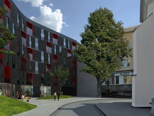 Brno’s architects probably based the building’s aesthetic feel on its contrast with the neighbouring St. Wenceslas’ Church in terms of mass as well as colour. The religious building is structured vertically and its mass features numerous details (originally it was a Gothic church, later re-Gothicized), and just like the neighbouring buildings, its facade is bright. On the other hand, Městská brána has a compact mass – it is a prism broken at an obtuse angle, with a dark casing of glass-cement plates. The clear and readable lines of the building, structured horizontally, are not disturbed by anything, with one exception – a narrow section, or recess in the base of the prism on both sides, one of which will serve for front yards for a café, while the other constitutes an arcade connecting the Kostelní Square with the Ostravice River bank.
