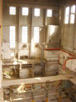 Under the main hall, reminding „a gallery“ is a former basement with a height of about two classic floors. Once upon a time there was installed the technology necessary to produce heat. Today it is a clean room. On the side are three large-sized hoppers, which served to place the needed fuel. The hall is reaching approximately 25 m height in this part and looks truly majestic, what convinces the view from the side staircase. Its height is even more amplified by narrow bands of windows, which are for this type of industrial buildings of the last century typical also from construction point of view (thin metal frame and rectangular glass panels).