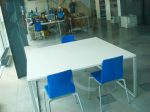 Architekt Alexy naozaj riešil zadanie komplexne a do detailu, nevynímajúc ani farebné riešenie. Takže priestory jedálne na prízemí sú žlté, čo príjemne oživuje sivé odtiene materiálov vo vstupe. Do toho sú na celoplošne liatej betónovej podlahe zakomponované farebné punkty z nábytku – stoličky s modrým čalúnením v kombinácii s bielym kancelárskym nábytkom – pracovnými stolmi a policami. Na druhom poschodí sídli vedenie firmy a ekonomické oddelenie, v menšej časti je „šéfovská“ zasadačka s kontrastnými červenými kreslami. Antracitová stena tu oddeľuje kancelársky priestor. Za ňou sú priestory sanity (tiež vo sviežom žltom odtieni) a „lahôdka“ v podobe pozinkovaného roštu – pultu, na ktorom je umývadlo. Aj to len potvrdzuje, že architekt dotiahol koncept do poslednej „matky“ na torte.