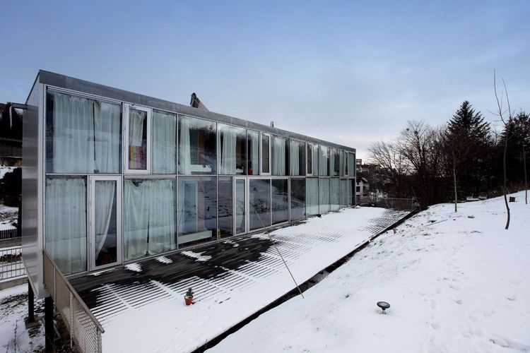 Dom H v Košiciach – zaujímavý a trochu provokatívny. To by mohli byť hlavné atribúty tohto projektu. Jedna časť (bazénový pavilón) – betónová na kopci, druhá – sklenená pod ním, na svahovitom pozemku v bývalej rekreačnej zóne. Vyznieva, ako by tam len „stanoval“. Teda, že je tam provizórne. Ale je to koncept. Preto je možno odlišný od tých ostatných na tomto mieste. Má totiž atmosféru. A to isté platí aj o viacdetnej rodine, ktorá tam v porozumení nažíva s mačkami a psami.