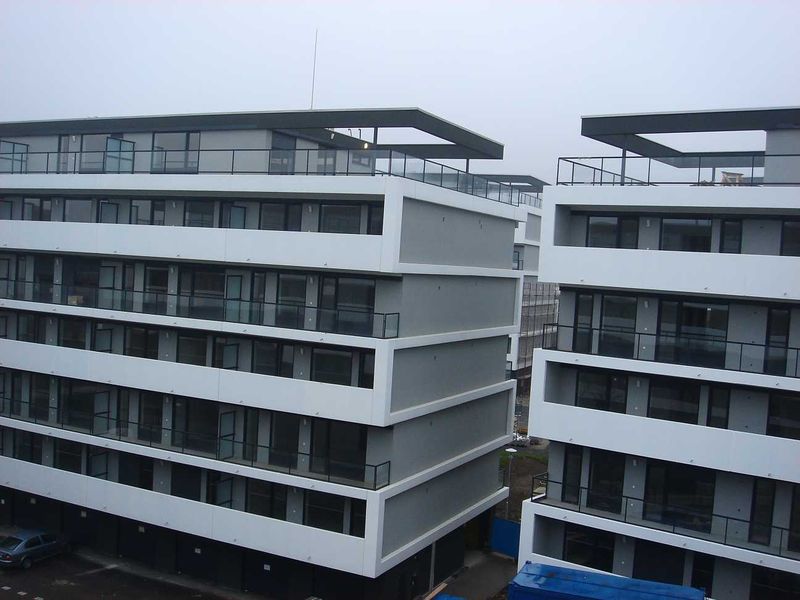 Tento jednoduchý raster potom prechádza aj do plných bočných fasád v podobe tenkých lemov. Strohý tvar a výraz betónových panelov je doplnený iba náterom bielou farbou. Konštrukčne sú panely prichytené o nosný skelet pomocou nerezových kotiev, dômyselne „skrytých“ v rámci zábradlia loggií. Zaujímavým prvkom figúry objektov je, že obe pozdĺžne fasády majú rovnaký výraz odlišujúci sa iba menšou presklenou plochou na severovýchodnej strane.