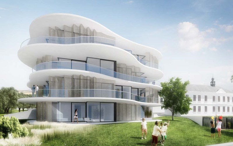 - Soutěžní návrh na rezidenční komplex „Perníkářka“ – Praha 6 – Nové objekty jsou organicky modelovány v kontrastu vůči původní rekonstruované usedlosti.