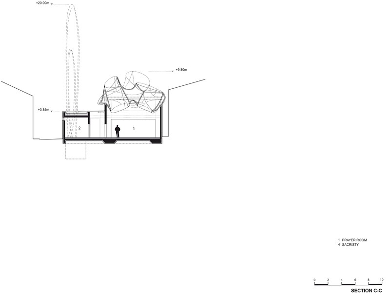 Architekti přiznávají inspiraci Le Corbusierovým klášterem La Tourette. Stejně jako u ostatních projektů COOP HIMMELB(L)AU probíhala výroba střešních prvků budovy kostela v loděnici, neboť specifické technologie zpracování kovů a složité tvarování pláště zvládají výrobci lodí nejlépe.