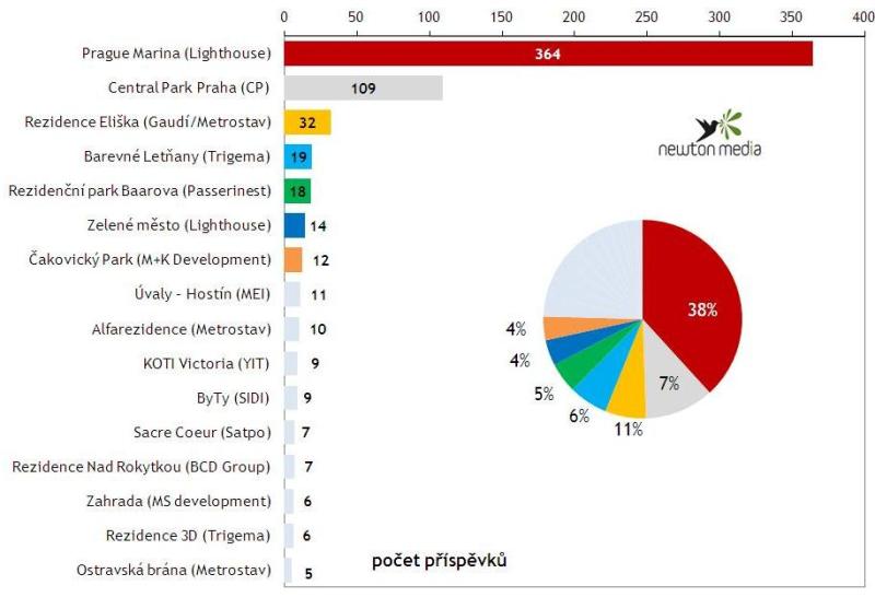 Na prvním místě žebříčku publicity se s až zarážející suverenitou umístil projekt Prague Marina (364 příspěvků ve sledovaném období leden – červenec). Mateřská společnost Lighthouse Group i zhotovitel čili Metrostav z této mediální obliby ovšem nadšeni být nemohli. Z holešovické novostavby totiž museli být 30. dubna na pokyn statika evakuováni nájemníci, a to poté, co budova začala praskat ve zdech. „Luxusní byty“ a příchuť katastrofy vytvořily třeskutou mediální kombinaci, což odrážely i titulky příspěvků: Blesk: Luxusní byty jim padají na hlavu; Aha!: Dům praská, kroutí se! ; Pražský deník: Skandál! Novostavba padala lidem na hlavu.