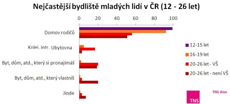 Mladí Češi do 26 let nejčastěji bydlí u rodičů. Týká se to nejen studentů (56 %), ale i těch, kteří již vzdělávací proces ukončili (51 %). Pětina vysokoškoláků mezi 20 – 26 lety si bydlení pronajímá, pětina nevysokoškoláků v tomto věku nějaký byt či dům vlastní. A téměř 70 % mladých lidí ve věku 20 – 26 let, kteří již nestudují a odstěhovali se od rodičů, žije se svou druhou polovičkou. Vyplývá to z nejrozsáhlejší syndikované studie TRU AISA. „Po ukončení středoškolského studia se od rodičů odpoutávají přibližně dvě pětiny těch, kteří ve studiu pokračují na VŠ – míří buď do pronájmu, nebo na kolej. Pouze 3 % z nich už vlastní nemovitost, kterou obývají. V tom se nejvíc liší od svých nestudujících vrstevníků – ti si stejným dílem bydlení pronajímají, nebo je přímo vlastní,“ uvádí Eva Králová, hlavní autorka studie z dílny TNS AISA. „S tím také souvisí fakt, že pro mladé lidi jsou dnes velké téma hypotéky a půjčky. Oproti loňsku si mnohem více uvědomují cenu peněz, učí se vyjít s menším kapesným než dříve. Podle všeho mama-hotel není pro všechny první volba, mnoho mladých lidí u rodičů zůstává nejen z pohodlnosti, ale do velké míry i z ekonomických důvodů,“ dodává Eva Králová.