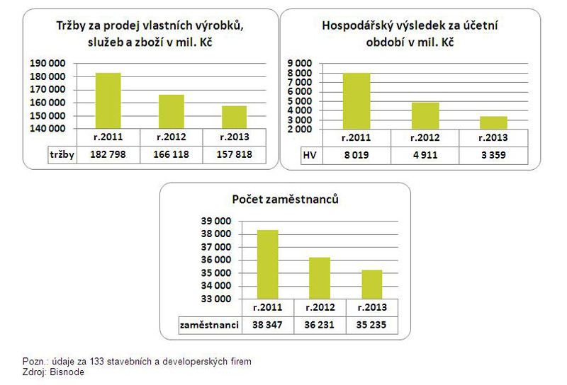 Ačkoliv tuzemská ekonomika vykazuje známky oživování, stavebnictví a development, jedny z nejdůležitějších odvětví národního hospodářství, pokračují v propadu. Společnost Bisnode v rámci analytické studie Stavebnictví a development hodnotila hospodaření 133 nejvýznamnějších hráčů na trhu. Jejich celkové tržby se v letech 2011 až 2013 snížily o 13,7 % na 157,8 mld. Kč a zisk propadl o 58,1 % na 3,4 miliardy. Navíc ve stavebnictví podniká 23 % rizikových subjektů, což je o 9 % více činí průměr této rizikovosti v rámci celé české ekonomiky.