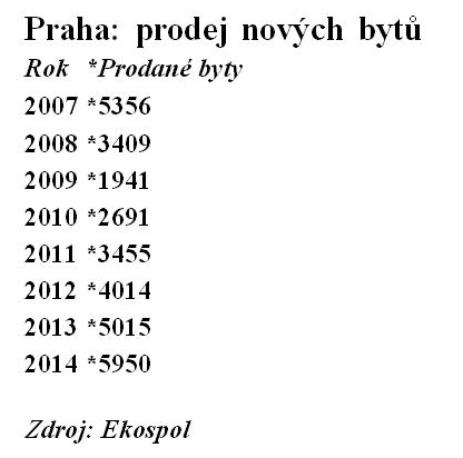 Developeři loni v Praze prodali 5 950 nových bytů, což představuje meziroční nárůst o 18,6 % – vyplývá to ze společné statistiky společností Ekospol, Skanska Reality a Trigema. Prodeje tak překonaly i předkrizový rok 2007, kdy se v hlavním městě prodalo 5 356 nových bytů. Zájem o nové byty v Praze byl i v posledním čtvrtletí loňského roku, kdy developerské společnosti prodaly 1 700 nových bytů. Dalších 6 750 bytů mají developeři připravené k prodeji. Ze statistik rovněž vyplývá, že pražský rezidenční trh táhnou vzhůru hlavně velké společnosti, takřka polovinu bytů totiž loni prodaly právě ony.