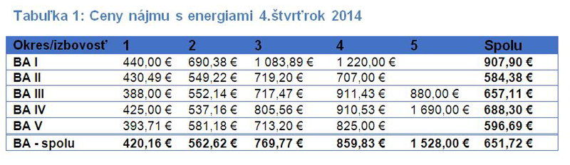 Cena prenájmu vo vyjadrení na jeden bratislavský byt s energiami mesačne sa pohybovala počas posledného štvrťroka 2014 na úrovni 651,72 €. Medziročne tak bola o takmer 11,5% nižšia. Z hľadiska ceny nájmu na meter štvorcový – cena klesá v závislosti so zvyšujúcim sa počtom izieb.