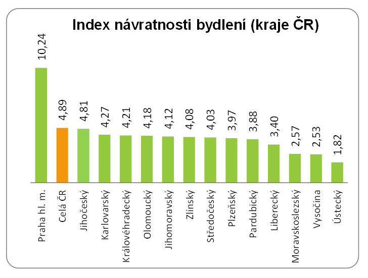 Vzhledem k dlouhodobému nárůstu cen nemovitostí dochází u nás k postupnému prodlužování návratnosti bydlení. Na celorepublikové úrovni a za všechny byty nyní index návratnosti bydlení dosahuje hodnoty 4,89 roku. Jinými slovy, průměrná česká domácnost by musela takřka pět let spořit všechny své čisté příjmy, aby si mohla pořídit byt v hodnotě 1 837 942 Kč.
