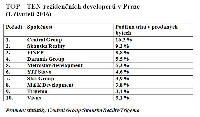 Firma Central Group prodala za 1. čtvrtletí 259 bytů, což je 16,2 % všech prodaných nových bytů v Praze a společnost tím jako jediný hráč na trhu překročil desetiprocentní podíl na prodeji. S více než stovkou prodaných bytů (s podílem 9,2 %, respektive 8,8 %) následují Skanska Reality a FINEP. Žádná z dalších developerských firem v Praze nepřekročila hranici 100 prodaných bytů.