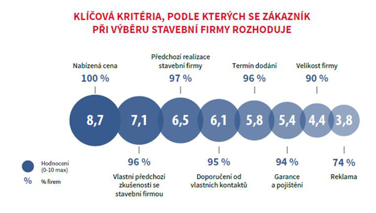 Podle ředitelů stavebních společností je při výběru dodavatele stavebních prací pro zákazníka hlavním kritériem stále cena. Tento fakt potvrdili všichni ředitelé stavebních společností a na stupnici od nuly do deseti (desítka = největší vliv na rozhodnutí zákazníka) přiřadili tomuto faktoru hodnotu 8,7. Důležitou roli podle dalšího průzkumu CEE Research také hraje vlastní předchozí zkušenost s danou stavební firmou (7,1) a stavby firmou realizované (6,5). Za nejméně podstatné jsou při výběru dodavatele naopak považovány reklama (3,8) a velikost firmy (4,4). Odpovědi ředitelů stavebních společností na tuto otázku se v závislosti na velikosti společnosti či jejím oborovém zaměření lišily jen minimálně.