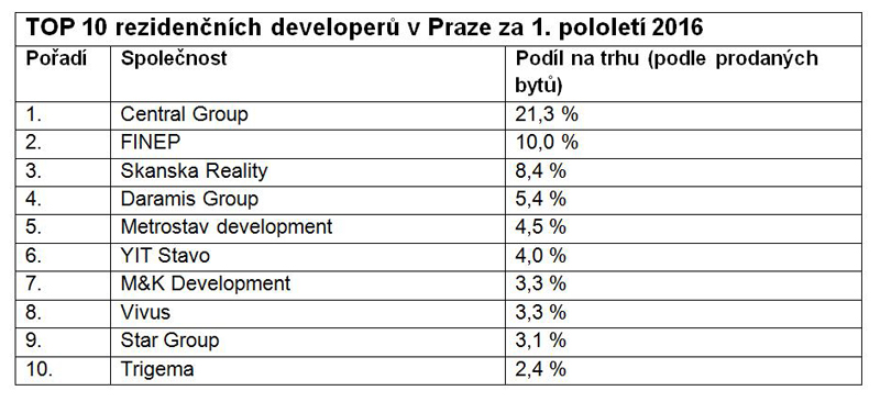 Jednoznačným lídrem nové bytové výstavby v Praze i celém Česku je i nadále Central Group, který se za první pololetí letošního roku na pražském trhu podílí více než 21 %. Oproti prvnímu čtvrtletí tak jeho podíl vzrostl o pět procentních bodů. Dvojkou na pražském trhu je FINEP, následuje Skanska Reality. Vyplývá to z aktuálních společných analýz trhu společností Trigema, Skanska Reality a Central Group, podle níž se za prodané počítají jen byty minimálně s vydaným územním rozhodnutím.