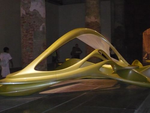 Letos se na bienále větší důraz kladl na myšlenky, na autorská východiska architektonické tvorby. Betsky vybral světové hvězdy, jimž dal k dispozici velkorysý prostor v bývalých loděnicích Arsenálu a nechal je – snít. Nevím, jestli zadání znělo „jen žádný dům“, ale tak to dopadlo. Už úvod je překvapivý – temná chodba měkkých tvarů na sobě nese proměnlivou kompozici postupně se rodící a zanikající vesmírné struktury, z rubu pod ní na malých obrazovkách běží ukázky z filmů se scénami, které mají (často velmi volný) vztah k architektuře a ke stavbám… A pak je divák vržen mezi většinou měkké tvary modelované z nejrůznějších materiálů, které mohou připomínat stavby (některé se tak i jmenují), ale také nemusí (mj. Zaha Hadid, Asymptote). Jako by hlavní bylo vést lidskou mysl, kam ona si zamane. Architekti jsou však profesí přece jen poznamenáni hloub, než si sami myslí, a v jejich prostorových kompozicích se stavba vždy nějak objevuje. Ať jako dům zbavený všeho kromě způsobu vedení nejrůznějších typů sítí (Penezič a Rogina Architects), či jako město z domů pro jednotlivce (Droog a KesselsKramer). Ale mezitím se objeví monumentální model skrývající holografický obraz života v domech na prestižní londýnské adrese (Doriana a Massimiliano Fuchsas), kde divák zjišťuje, že vše se točí kolem – jídla.