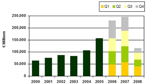 Graph – European investments: the level of business trade volume in year 2008 is comparable with year 2004. Source: CBRE