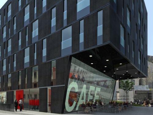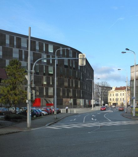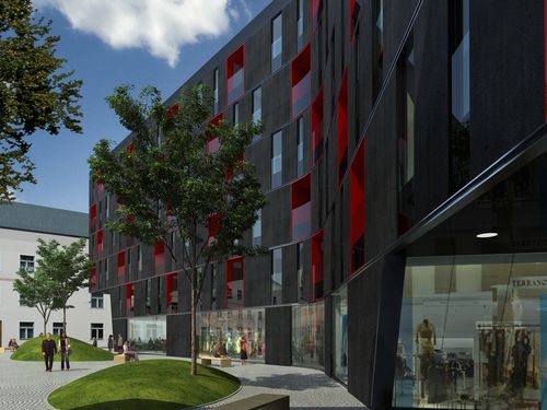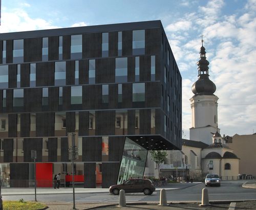 Brno’s architects probably based the building’s aesthetic feel on its contrast with the neighbouring St. Wenceslas’ Church in terms of mass as well as colour. The religious building is structured vertically and its mass features numerous details (originally it was a Gothic church, later re-Gothicized), and just like the neighbouring buildings, its facade is bright. On the other hand, Městská brána has a compact mass – it is a prism broken at an obtuse angle, with a dark casing of glass-cement plates. The clear and readable lines of the building, structured horizontally, are not disturbed by anything, with one exception – a narrow section, or recess in the base of the prism on both sides, one of which will serve for front yards for a café, while the other constitutes an arcade connecting the Kostelní Square with the Ostravice River bank.