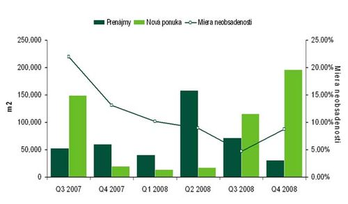 Bratislava achieved the 1.162 millions m2 total area of modern office spaces (including Slovak Savings) in the fourth quarter of 2008, while new buildings in newly built-up business zones create 60% hereof and 30% is localized in the centre according to the latest news of CB Richard Ellis (CBRE) Company. The fourth quarter of 2008 brought above 22 000 m2 of new spaces, while all of them were new buildings, as representatives of CBRE notified at the recent meeting with journalists. The newly crated offer presented 180 000 m2 in year 2008 what is the increase by 44% compared with previous year. It is assumed, that further 164 000m2 will be added in year 2009, the margin of which will rise in the Digital Park II, the Riverpark, the Galvániho BC IV, the Emporia Towers and Jarošova OC Projects.