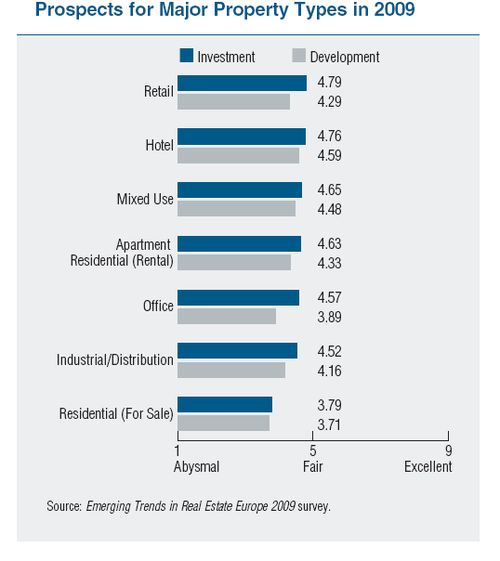 Developeri, banky aj realitní sprostredkovatelia z celej Európy podľa štúdie zhodne potvrdili, že rok 2009 bude „veľmi zložitý“, pričom nie je vôbec jasné, kedy sa situácia obráti. Na trhu bude naďalej pretrvávať nedostatok nielen vlastných zdrojov, ale tiež úverového financovania. Zatiaľ nevedno, či ide o vyčkávajúcu stratégiu v očakávaní lepších cien alebo o problém fungovania trhu s hlbším pozadím. Povšimnutiahodným faktom je, že hodnotenie celkovej atraktivity v škále od 1 do 9 je dnes vôbec najnižšie za celé obdobie publikovania štúdie by Emerging Trends in Real Estate® Europe.
