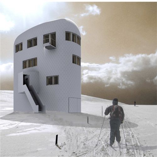 The winning design by Prokš and Přikryl offered a distinct architectural concept with a suitable material solution. The house constitutes a closed, low-energy tower of an aerodynamic shape, easily withstanding wind and snow. The whole top floor of the tower is used as a meteorological workplace, with a 360° view of the surrounding landscape. The panel also appreciated the technical design. A timber supporting structure is complemented with a sandwich shell covered with titanium-zinc sheets. Power is to a large extent supplied from a small wind power plant; the main source of heat is a heat pump, complemented with solar collectors. The sanitary system is designed as low-demand, with a very well-defined concept.
