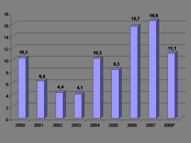 Results of the Polish economy from January and February 2009 document the impact of the global crisis in local conditions. According to the data from GUS – the Main Statistical Office of the Republic of Poland the state budget deficit represented 5.3 billions PZL. In January 2009 there was turnover decrease in foreign trade: export revenues fell by 26.3% to the level of 6.8 billions Euro and imports by 28.0% to 7.7 billions. The total deficit in foreign trade – it fell to the level of 920 millions Euro compared to 1.5 billions Euro in January 2008. Although GDP growth in Poland vs. EU (%) is higher, the slowdown is evident in last three years: 6.6 / 2.9 (2007), 4.9 / 0.9 (2008), 2.0 / –1.8 (forecast 2009). Obvious is also the growth of inflation (%): 2.6 / 2.3 (2007), 4.2 / 3.7 (2008).