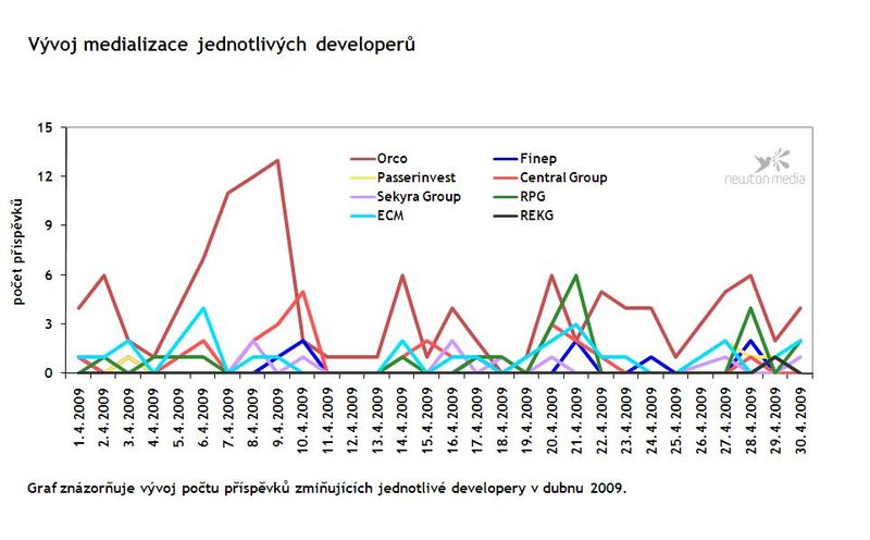 Readers who want to make a picture about the future development of the prices of flats on the basis of the daily press definitely noticed many different and often quite opposite reports in April. They were given perhaps all conceivable scenarios: the prices will stagnate; flats will be cheaper; flats are already cheaper. There were also some rare voices that the prices of flats would go up. This is also obvious from an analysis performed by Newton Media, which surveyed the “presence” of property developers in national dailies, on the radio and on TV and in social and selected economic (E15, Euro, Ekonom, Profit) magazines in April.