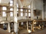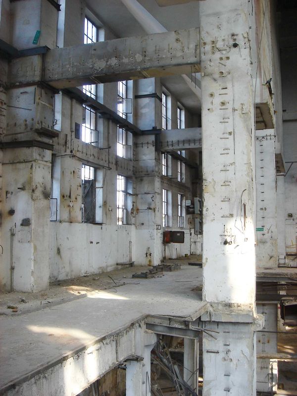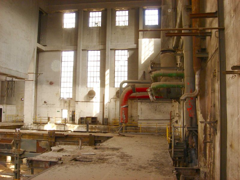 Under the main hall, reminding „a gallery“ is a former basement with a height of about two classic floors. Once upon a time there was installed the technology necessary to produce heat. Today it is a clean room. On the side are three large-sized hoppers, which served to place the needed fuel. The hall is reaching approximately 25 m height in this part and looks truly majestic, what convinces the view from the side staircase. Its height is even more amplified by narrow bands of windows, which are for this type of industrial buildings of the last century typical also from construction point of view (thin metal frame and rectangular glass panels).