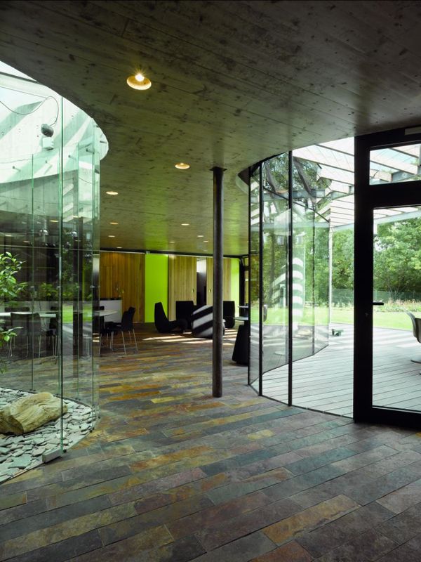 unexpected link of spaces and round windows give the building with their