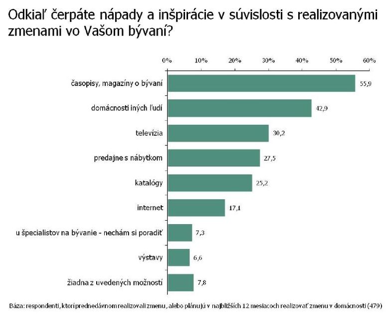 Additional interesting information of the GfK survey is, from where Slovaks draws inspiration and ideas in connection with changes in the household. As the chart shows, most often it is from various journals and magazines on housing (56%), then from other people households (42%), but its role also plays television (30%). Other options, where, according to the respondents, can be gained new impulses and ideas are also furniture shops (28%), catalogues (25%), Internet (17%), various exhibitions (7%) and roughly the same number of people allowed to consult professionals (7%).