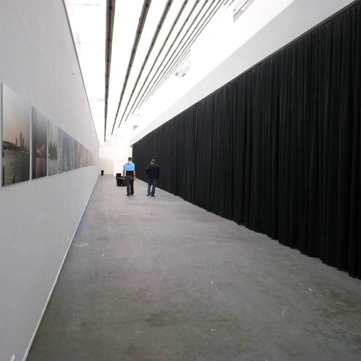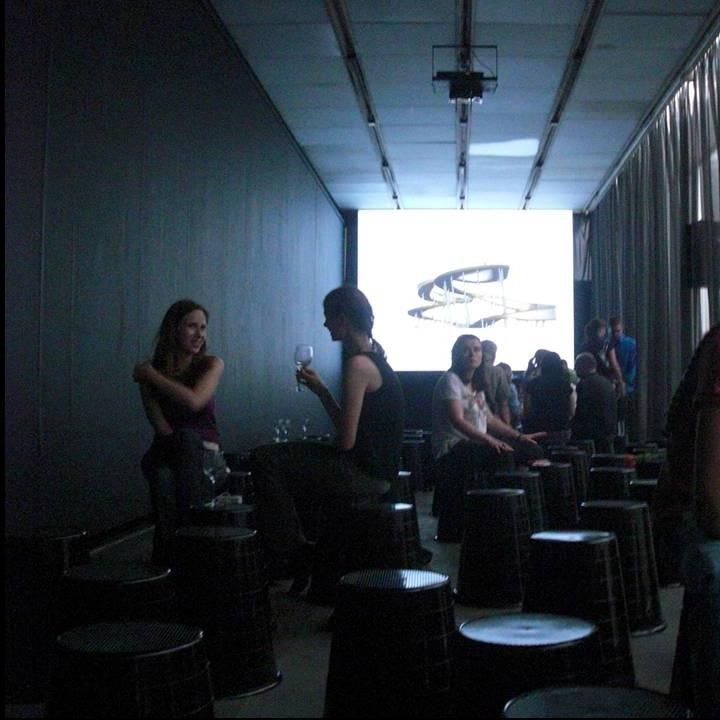 The concept of the exhibition and the shared modernistic theme – Megalithic „oblique“ shapes – are so easily implanted into the sloping area so that they create maximal symbiosis: if it was designed exclusively for this exhibition and vice versa. Longitudinal space of the bridging is divided to the light and the dark areas, thus provoking the already banal question of galleries: „white cube“ or „black box“? The light area (under daylight) shows 50 posters with projects, the dark one – intimate – offers watching video-projections split into three parts: Program, Parking! and Remix.