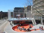 The method of organization and suggesting the objects in the atelier NL Architects is based on creating layers – kind of functions layering. As if one function „hid“ the second one – the university bar is covered by the roofed basketball playground and intersected by the skejt U-ramp. The exchange station is inside the black statue, with diagonally placed hole, a climbing wall and a single window serving as a basketball basket. Or the garden coated by villa protecting its adequate climate from strong cold…