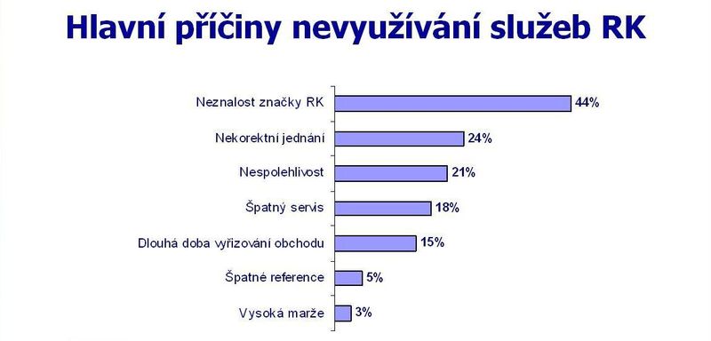 The survey by MindBridge, focused on this issue, showed that only 54% of all real estate transactions are performed using real estate agencies in the Czech Republic. The potential customers are discouraged from using the services of real estate agencies by their low awareness of agency brands, unfair behaviour, unreliable employees and poor services. On the other hand, the survey shows that the prices of real estate agency services – according to David Krajný the transaction price ranges, as a standard, between 3 and 5% of the price of the real estate concerned in the Czech Republic – are not a prohibitive factor for the demand (only 3% of the respondents explained their lack of interest in real estate agencies by the high prices of their services).
