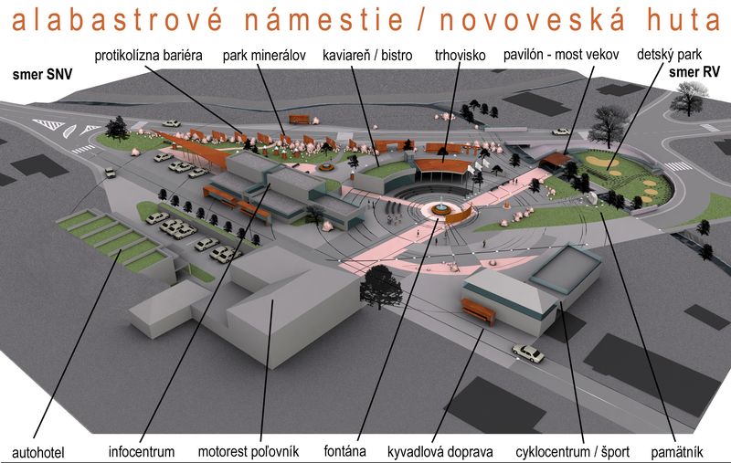 The direct contact of the Alabaster Square with Novoveská, Hnilecká route and the state highway II/533 is important for tourism, predisposes this area of the square as a tourist footing point. " The town is interested in raising a mining village traditions and creating a sort of starting point to hiking and biking trails of Slovenský raj (Slovak Paradise) and therefore provides urban documentation," adds Arch. T. Štubňa, the head of territorial planning and building order of MsÚ Spišská Nová Ves.