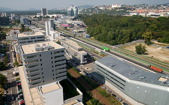 Although the Tatra City is officially in Černyševského Street it has much more to do with parallel ongoing Einstein's Street, partly identical with the Petržalka stage of the D1 motorway. The location on the interface of the old and the modern zone (elevated road of Jantárová cesta) became a real trump card in a sleeve of the developer. The architecture of „a compact block on a non-compact territory“ (in terms of professional characteristics of Imro Vašek) corresponds to the new as well as the panel residual substance, really unobtrusive.
