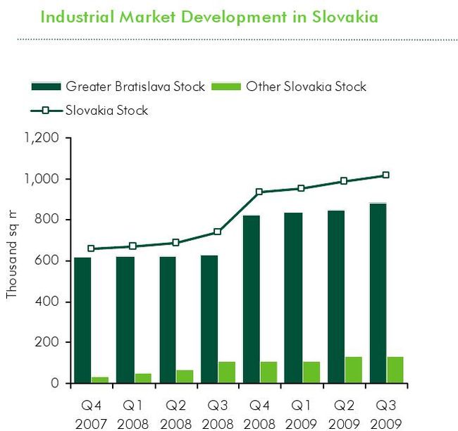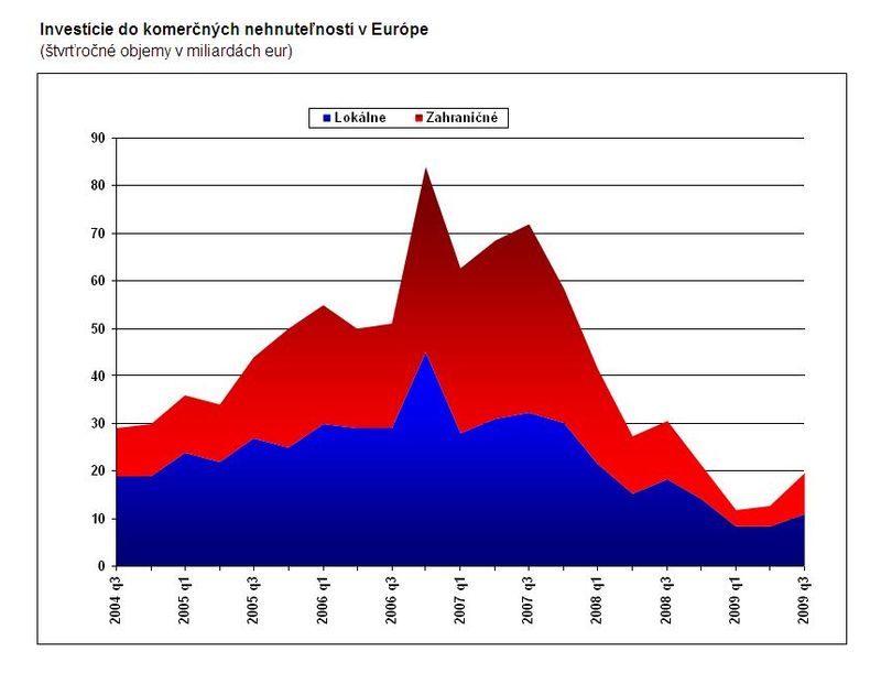 The most attractive segment of the market remain office space, where the volume of transactions increased by 87% to 10.6 billion € in the 3rd quarter. It is expected that by the end of 2009 will represent about 90% of the total volume in the Central Europe. Significantly also increased the area of industrial property, while retail trade was in terms of financial market characterized by particular lack of quality products and demandingness of major projects such as shopping centers, by C&W. German institutions and open-end funds remain in Slovakia an under-represented foreign group – because of fear of economic instability and a relatively small market.