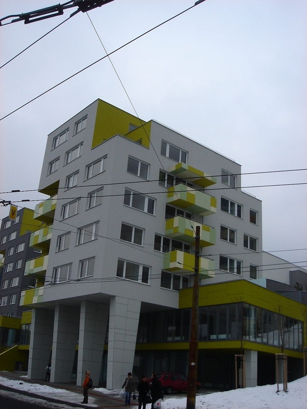Aj keď využívanie svahovitých pozemkov na výstavbu nie je u nás kvôli vysokým stavebným nákladom na zemné práce a zakladanie objektu až také časté, vyskytnú sa aj svetlé príklady spolupráce investora a architekta, ktoré výnimky z tohto pravidla len potvrdzujú. Na celkovej ploche pozemku 4 429 m2 architekti zastavali 2 570 m2 a v dvoch takmer identických hmotách s vybavenostnou podnožou, rozdelených vertikálne prístupovými exteriérovými schodmi, dosiahli celkovú úžitkovú plochu 10 870 m2 na šiestich resp. ôsmich nadzemných podlažiach s obostavaným objemom 32 000 m3, pričom dve sú zapustené do svahu a využívajú sa ako garáže.