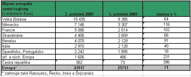 Evropské investice do realit podle společnosti CB Richard Ellis v posledním čtvrtletí roku 2009 dosáhly objemu 25,7 mld. eur, což představuje 42% nárůst oproti předchozímu čtvrtletí. Zároveň je to čtvrtletně nejvyšší investovaná částka od kolapsu banky Lehman Brothers a potvrzení, že zájem investorů, který pozorujeme od poloviny roku 2009 se rozšiřuje po celé Evropě. Během celého roku 2009 se v Evropě do realit investovalo 70 mld. eur, v roce 2008 to bylo 121 miliard. Nárůst investiční aktivity se týkal takřka všech zemí. Francie a Německo, dva největší trhy v kontinentální Evropě, dokonce objemy realitních investic zdvojnásobily. Ve střední a východní Evropě investice vykázaly ve 4. čtvrtletí strmý nárůst o 231 %, ovšem první pololetí bylo v celém regionu investičně velmi slabé.