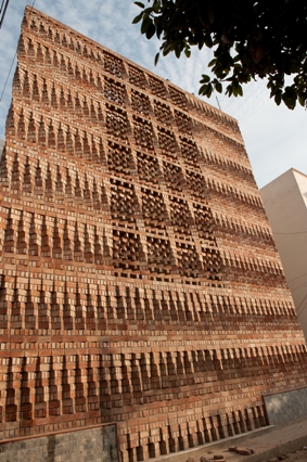 Druhá cena je – možno říci – roztančená. Až neuvěřitelně totiž působí čelní stěna Dokumentačního centra lidských práv pro Jihovýchodní Asii v Novém Delhi, která je dílem ateliéru Anagram Architekti. Co všechno lze s cihlou udělat! Nejen plasticita, ale skutečně dojem pohybu ten rozmanitý sklad cihel vyvolává.