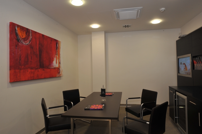 Opticky je show-room rozdělen galerií ve výši prvního patra, kde se nachází též konferenční místnost, kterou mohou zákazníci Infiniti Centrum Praha využívat ke svým jednáním zcela zdarma. Další jednací prostory, včetně business lounge a kanceláří personálu jsou umístěny v přízemí pod galerií. Vstřícnost a přátelské vyladění všech prostor přitom podtrhuje skutečnost, že většina stěn je prosklená. „Chceme navodit atmosféru jako v malých luxusních boutique hotelích,“ konstatuje Ivana Zimová. Přírodní leštěný kámen, keramika v pastelových barvách a teakové dřevo na jedné straně pomáhají vytvořit takřka domáckou atmosféru, sklo a kov na straně druhé deklarují přeci jen technicistní a praktický charakter stavby. Záměr je zřejmý: architektura autosalonu má za úkol evokovat podobnou náladu a emoce, které vyvolávají samotné vozy Infiniti.