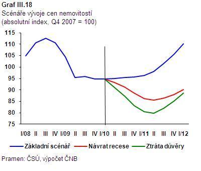 V ČNB vytvořili pro období do roku 2012 tři scénáře vývoje: „základní“, který také považují za reálný, druhým je „návrat recese“ a nejhorší třetí, pod názvem „ ztráta důvěry“. Ten je založen na kombinaci slabého hospodářského růstu (a posléze návratu recese) s krizí na finančních trzích a potažmo i ve finančním sektoru. Scénář druhý a třetí ČNB sice nevylučuje, nicméně jejich naplnění považuje za málo pravděpodobné. Domácí finanční sektor by nicméně podle ZFS zůstal stabilní a dokonce i ziskový při kteréhokoli variantě vývoje. Bankovní zisky by ovšem z předkládaných 47 a 63 mld. Kč letos a v příštím roce poklesly na něco málo přes 19 mld. Kč v roce 2011 pro oba scénáře a dále až na 8,3 a 2,6 mld. Kč (scénář „ztráta důvěry“) v roce 2012.