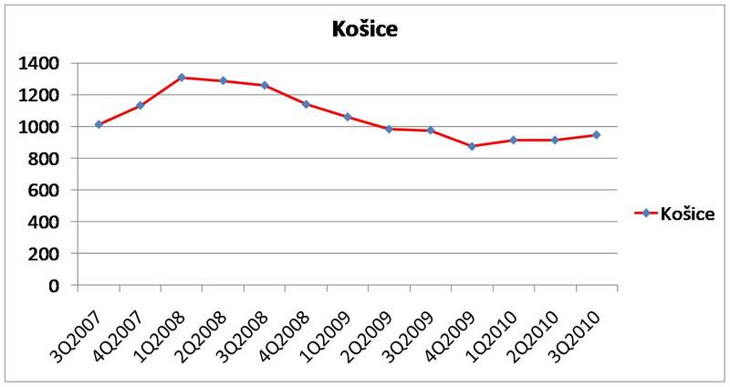 - Priemerná cena (€/m2) 2-izbového bytu v Košiciach od 3.Q.2007 do 3.Q.2010 (graf)