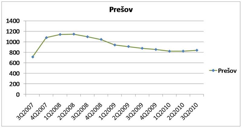 - Priemerná cena (€/m2) 2-izbového bytu v Prešove od 3.Q.2007 do 3.Q.2010 (graf)