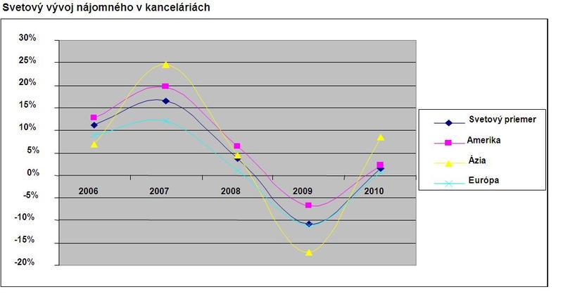 Po zostupnom trende z roku 2009 sa globálny trh kancelárskych priestorov konečne spamätal a v druhom polroku 2010 zaznamenal podľa vyhodnotenia C&W dopytom inšpirovaný vzostup nájomného o jedno percento. Tento nový impulz má na svojom konte ázijsko-tichomorský región, kde sa nájmy v priebehu roka vyšplhali v priemere o 8 %. V samotnom Hongkongu, mekke svetového obchodu a finančníctva, vyleteli o neuveriteľných 51 percent nahor, takže tento vo svetovom meradle najdrahší trh zdražel tentoraz naozaj závratne.