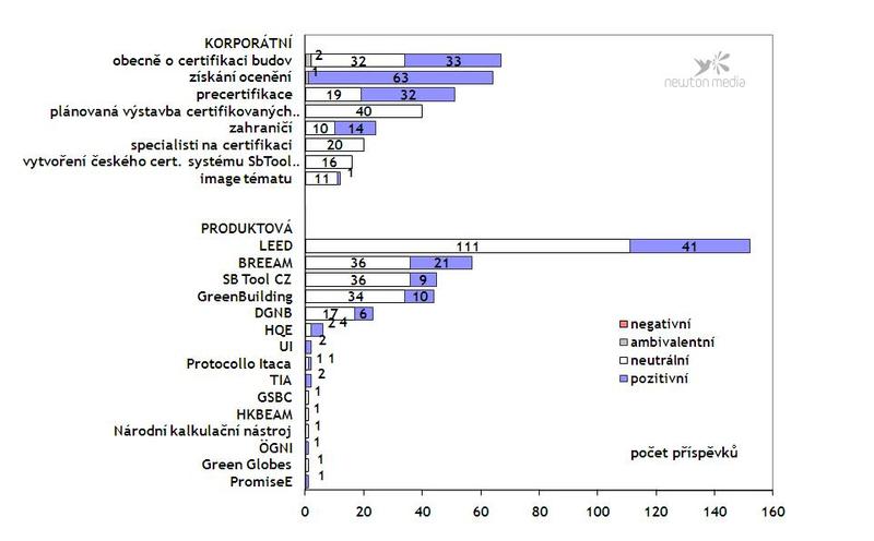 S pozitivním mediálním ohlasem se setkalo ocenění konkrétních budov či pochvalné úvahy o jednotlivých certifikátech (37 % pozitivních příspěvků). Letmo se autor příspěvku „ČVUT bude zkoumat, jak fungují zelené domy“ (E15 29. 12. 2010) pozastavil nad problémem, kterým certifikace v Česku je: „Přestože se někteří stavitelé certifkáty chlubí, zkoušejí se zatím různé zahraniční modely, ale jednotná metodika chybí.“ Celkově bylo o sledovaném tématu podle analýzy společnosti Newton Media během období březen 2010 – březen 2011 publikováno 233 příspěvků.