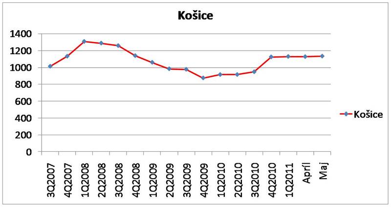 4) Graf 2: Vývoj priem. ceny 1 m2 dvojizbového bytu v Košiciach za