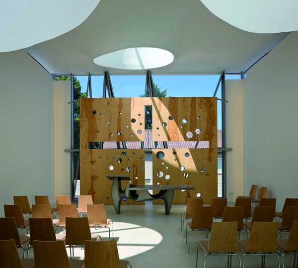 Architekti přiznávají inspiraci Le Corbusierovým klášterem La Tourette. Stejně jako u ostatních projektů COOP HIMMELB(L)AU probíhala výroba střešních prvků budovy kostela v loděnici, neboť specifické technologie zpracování kovů a složité tvarování pláště zvládají výrobci lodí nejlépe.