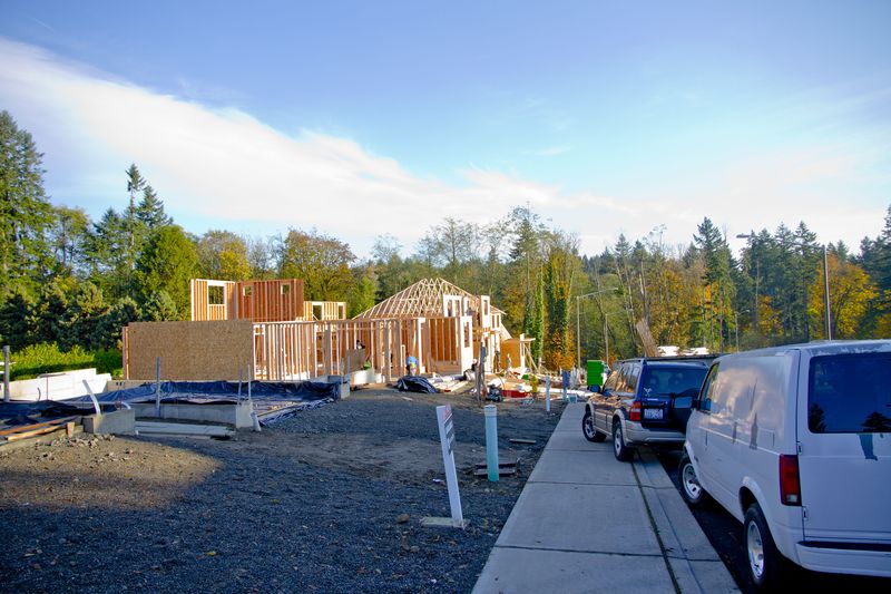 dřevěný dům ze svislých dřevěných fošen zvaných „studs“. Dělníci