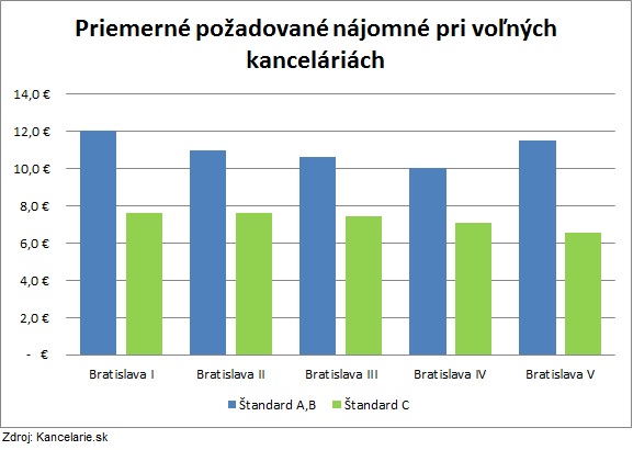 | Bratislava V | 11,5 €/m2/mesiac | 6,5 €/m2/mesiac |