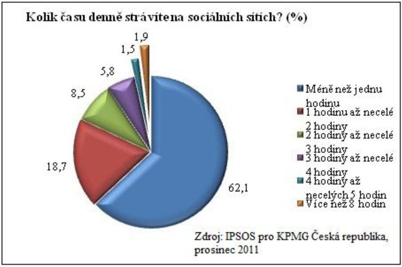 Jak dále průzkum ukázal, většina Čechů, kteří mají v práci přístup k internetu, stráví denně na sociálních sítích méně než jednu hodinu. Téměř pětina respondentů jim věnuje maximálně dvě hodiny času denně, necelá desetina pak až tři hodiny. „Zajímavá data vyšla také z prosincového průzkumu celosvětové sítě poradenských společností KPMG provedeného v 31 zemích pěti kontinentů s názvem The Converged Lifestyle. Z 9 600 respondentů totiž aktivně tráví čas na sociálních sítích převážná většina z nich, 86 %, přičemž bezmála polovina alespoň hodinu denně,“ srovnává Jan Martínek.