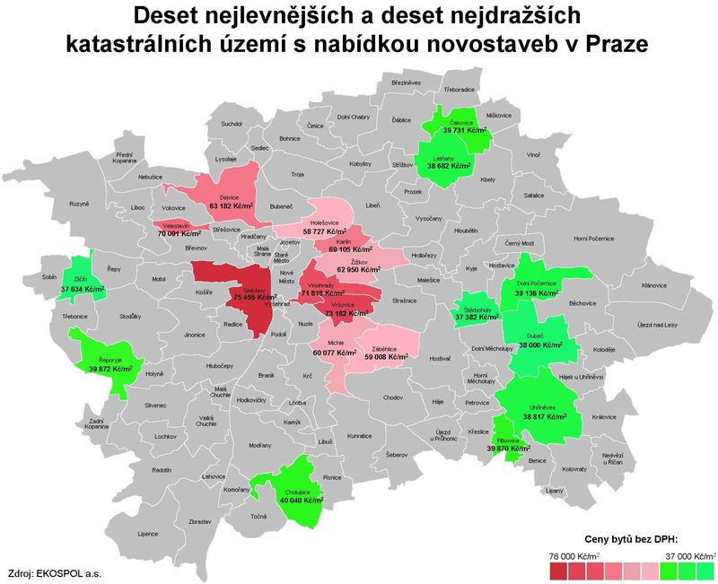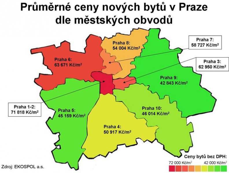 Přesně 48 433 Kč za metr čtvereční bez DPH. Tolik v průměru stojí metr úplně nového bytu v Praze. Při současné výši snížené 14% sazby DPH to znamená cenu 55 214 Kč vč. DPH. Průměrná garsonka o podlahové ploše 35 metrů čtverečních tak kupujícího vyjde na více než 1,9 mil. Kč vč. aktuálně platné DPH, byt 2+kk o ploše 50 metrů pak na více než 2,7 milionu včetně daně. To vše vyplývá z cenové mapy, kterou zpracovali analytici společnosti Ekospol.