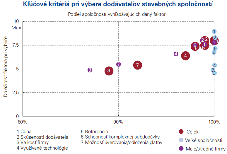 Výskum CEEC Research a KPMG Slovensko, ktorý používa metódu dvojrozmernej segmentácie vzorky (veľkosť zúčastnených spoločností + ich stavebné zameranie), zároveň preukázal, že najmenej dôležitým kritériom pre výber dodávateľskej firmy je jej veľkosť. Pri vyjednávaní podmienok majú však viacej úspechov veľké stavebné spoločnosti: ceny ich dodávateľov klesli o štvrtinu.