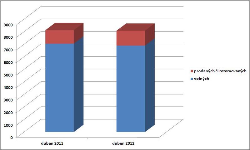 K 20. dubnu tohoto roku bylo podle citované analýzy na území hlavního města „v chodu“ celkem 306 developerských rezidenčních projektů. Ty nabízejí celkem 12 854 bytových jednotek, z nichž 6 890, tedy 53 %, ještě není prodáno. Pro srovnání – přesně před rokem, v dubnu 2011, to bylo 11 570 bytů celkem a z toho 7 050 volných (60 %). Dnes je tedy v tomto ohledu situace lepší, nicméně po zvýšeném prodeji v závěru minulého roku (v důsledku blížící se změny sazby DPH) nyní ovšem nabídka volných bytů opět mírně roste. To je způsobeno přílivem nových projektů – za uplynulých 12 měsíců bylo dáno do prodeje 1 206 nových bytů!